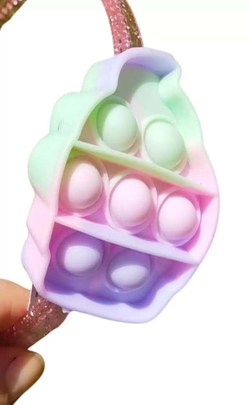 Linda Tiara (Arco) com dentes para sua pequena, o que é mais legal com um pequeno Pop It / Fidget Toy, todo colorido, além de ficar linda com um arquinho, tem um pequeno pop it para brincar.