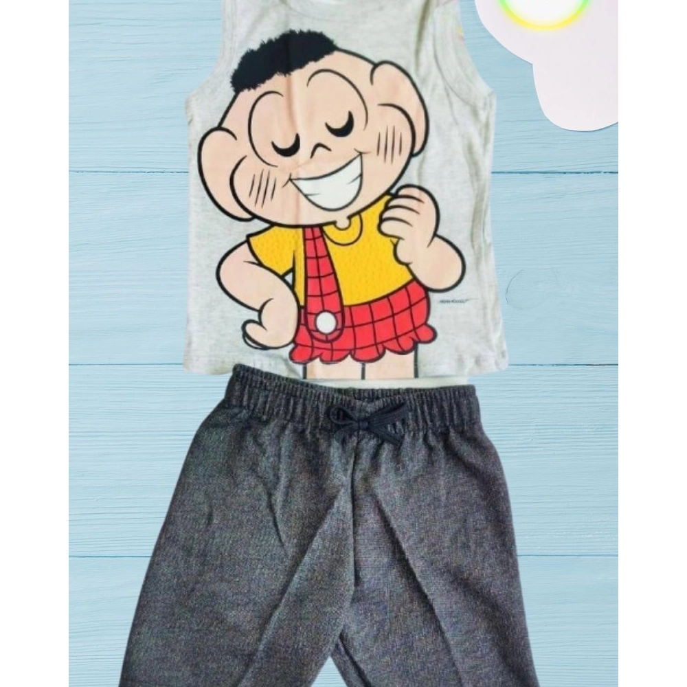 Conjunto confeccionado em meia malha 100% algodão com estampa.